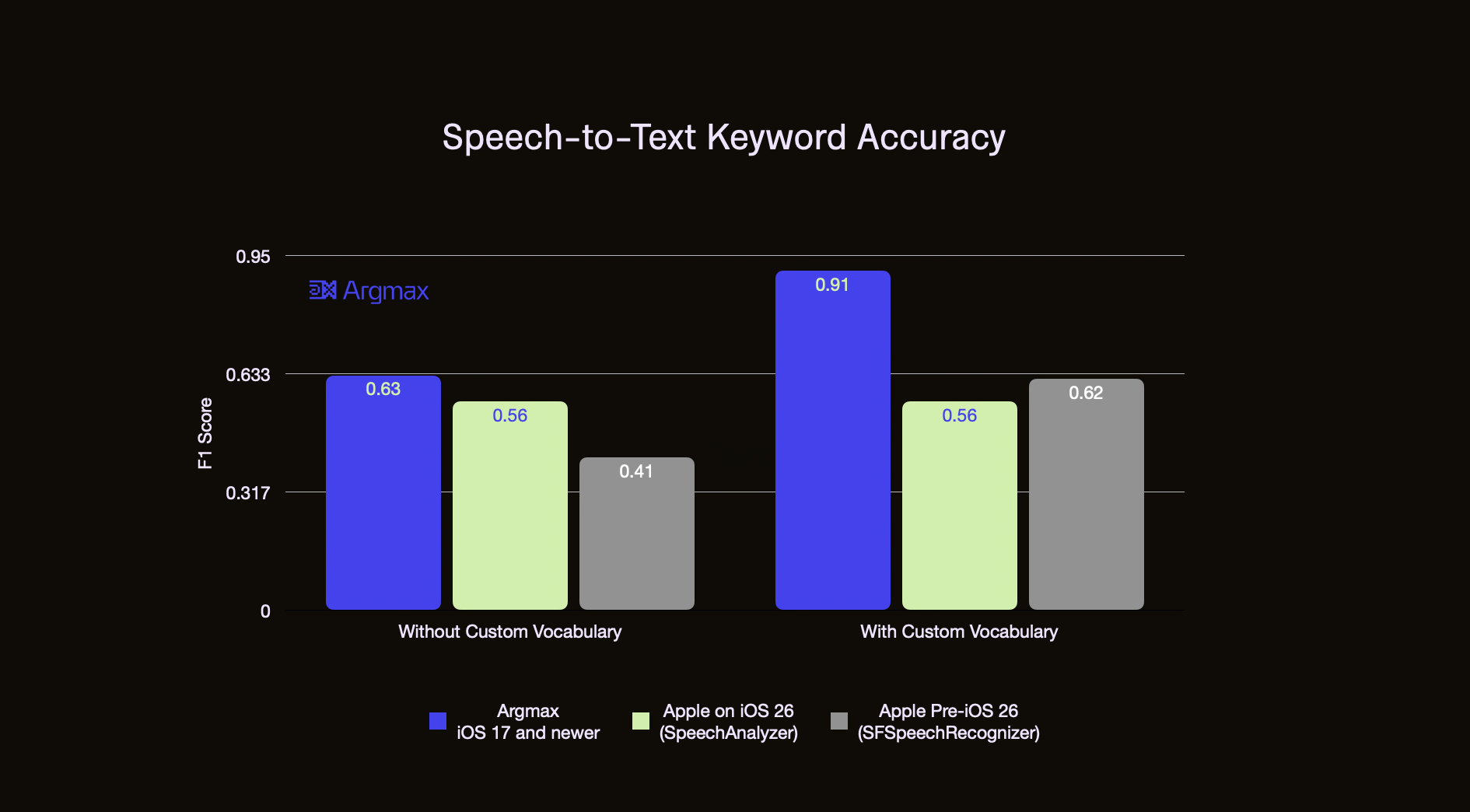 The following benchmark demonstrates the keyword recognition accuracy of Apple SpeechAnalyzer (iOS 26), Apple SFSpeechRecogizer (pre-iOS 26) and Argmax SDK. Keywords are defined as people, company and produt names that occur in the earnings22 dataset. Please see this GitHub repository for details.